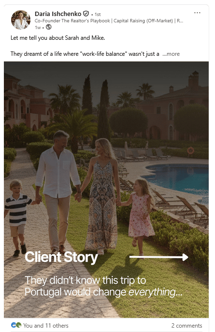 We created a fictional story around one of our listings: a short narrative with made-up characters, designed for a carousel post on LinkedIn.