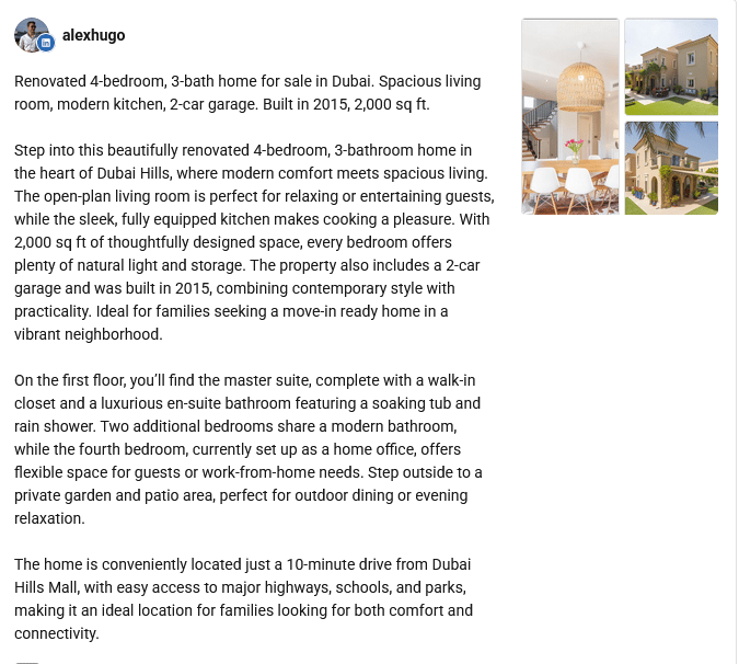 “Renovated 4-bedroom, 3-bath home for sale in Dubai. Spacious living room, modern kitchen, 2-car garage. Built in 2015, 2,000 sq ft.