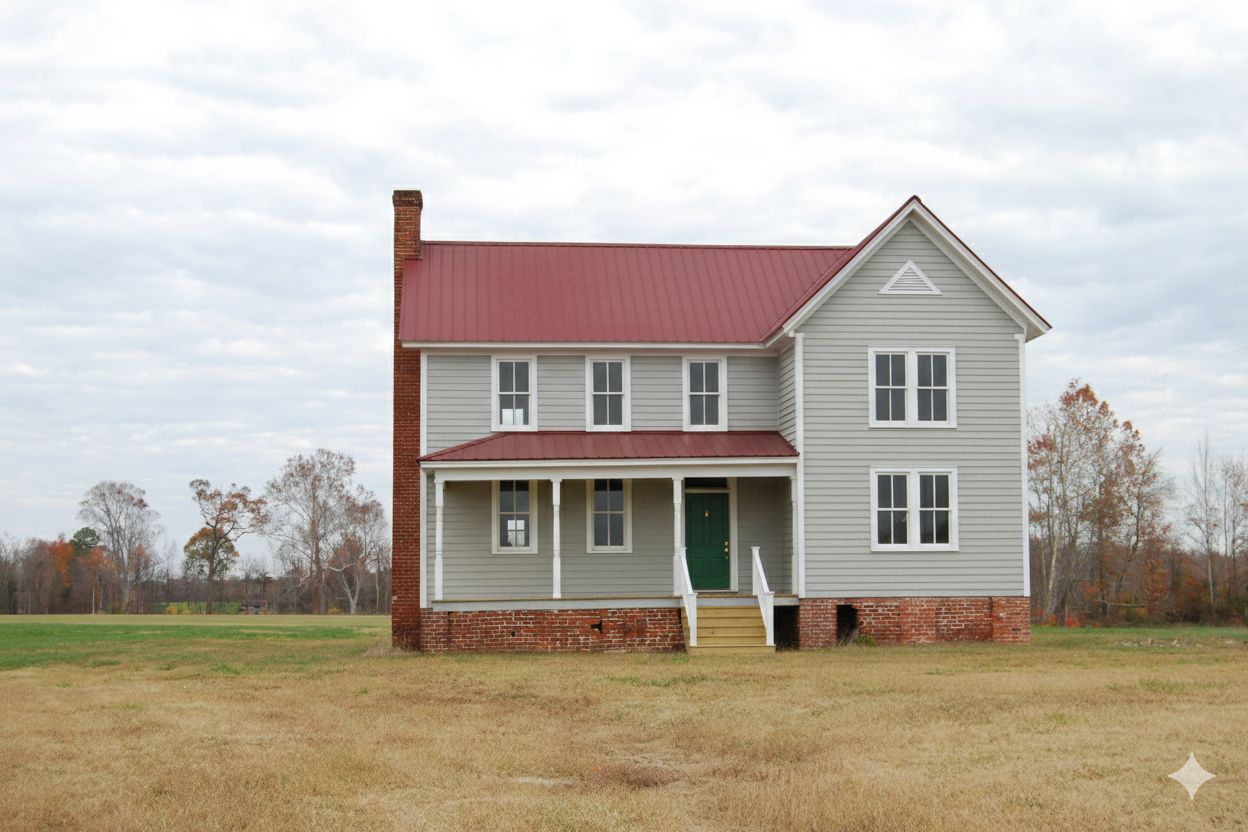 Using this property in the picture, create a professional architectural visualization of its renovated version, preserving the exact architectural style and all main features and materials. Apply colors that match the house’s style and era, keeping the palette realistic and cohesive. Retouch, repair, or reposition any worn, damaged, or broken materials so they look brand new, and align or rebuild any structural elements so the house appears sturdy, complete, and ready to move in. Do not add any elements that are not already part of the property. Render in natural daylight with a front-facing perspective and slight angle to showcase depth, and use high-resolution, realistic textures for all surfaces to enhance the final presentation.